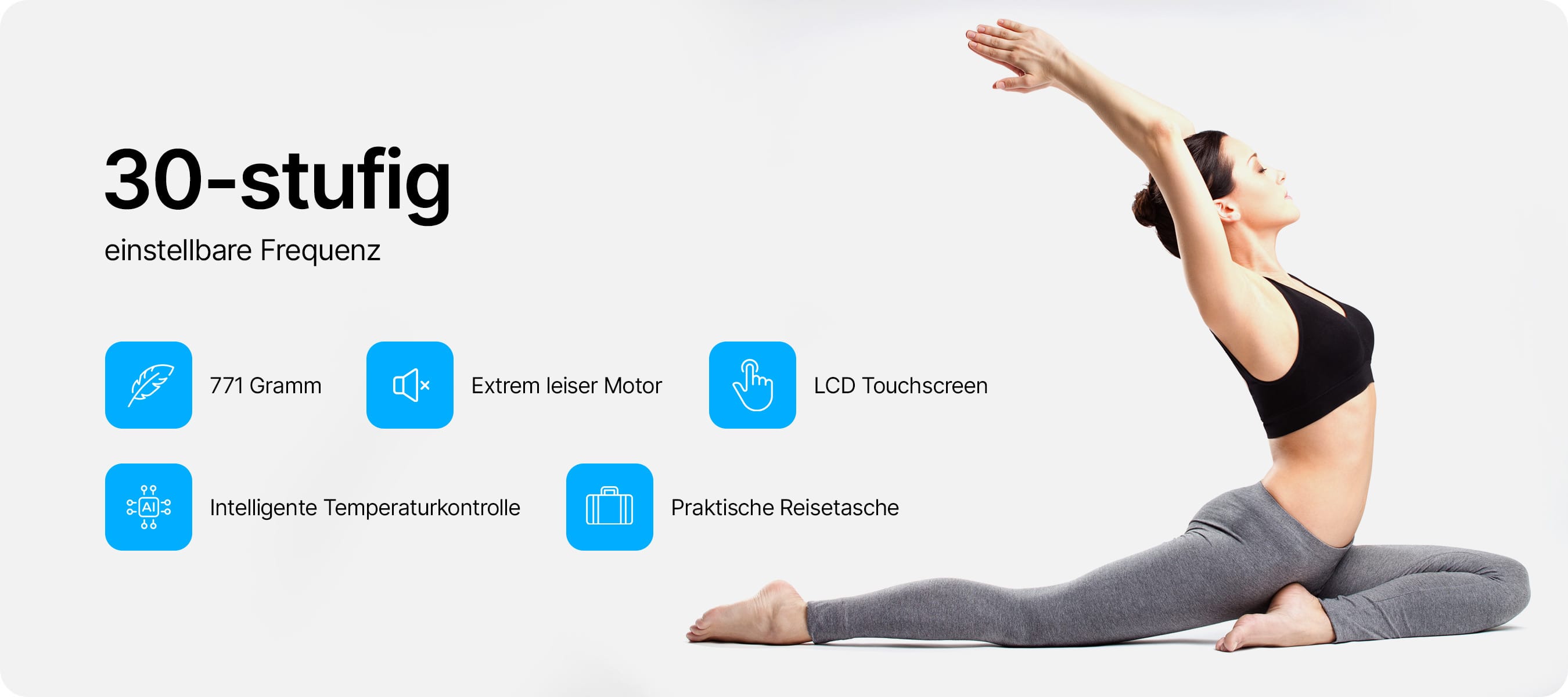 Ja, die Massagepistole ist besonders benutzerfreundlich. Mit einem intuitiven Touch-Bedienfeld und 30 Geschwindigkeitsstufen finden Sie schnell die richtige Intensität für Ihre Bedürfnisse.