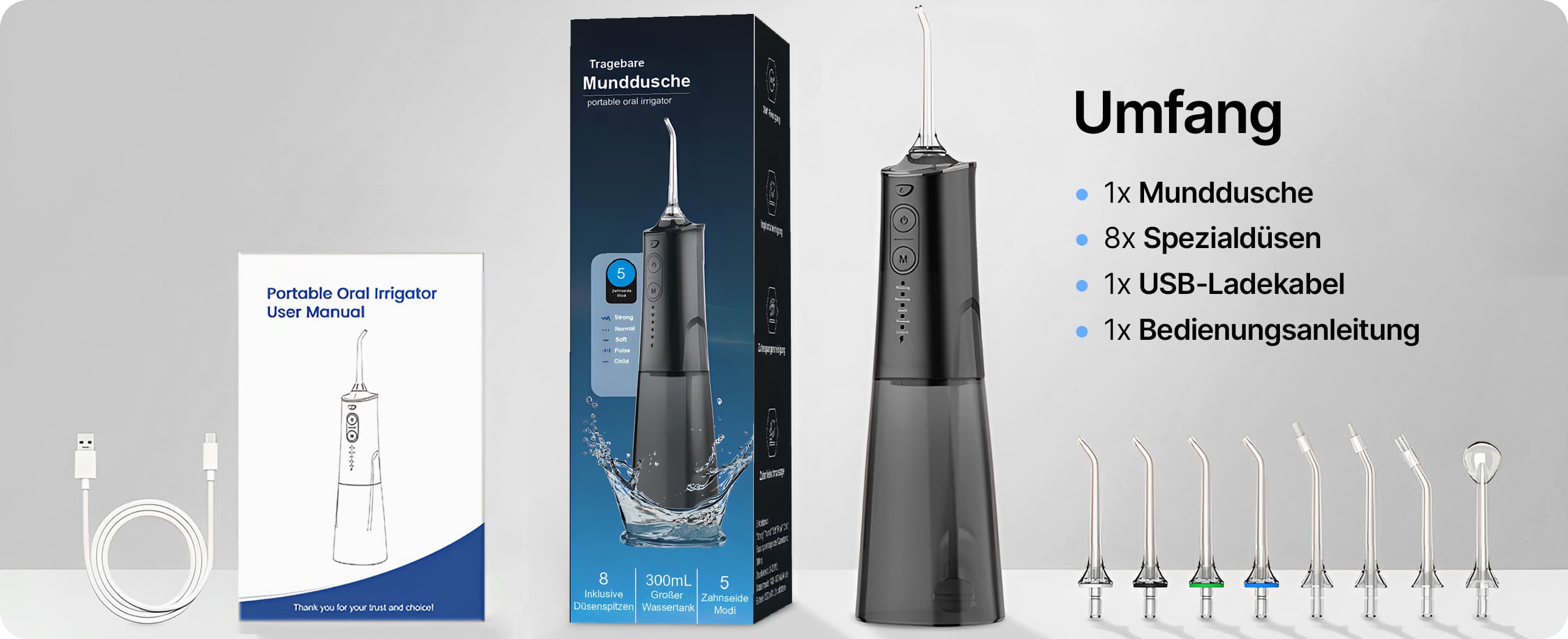 Munddusche, 4 Düsenaufsätze, Ladekabel, Bedienungsanleitung